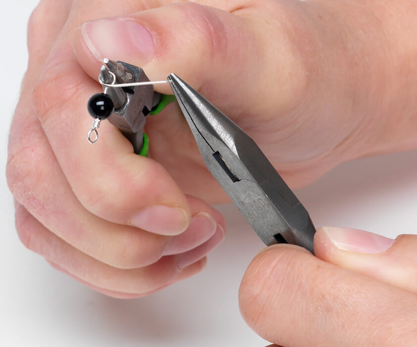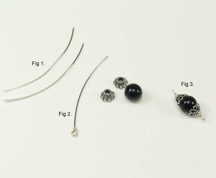 Thread the bead and caps through the wire up to the loop and then make a similar loop and wraps at the other side of the bead to secure (fig 3.).