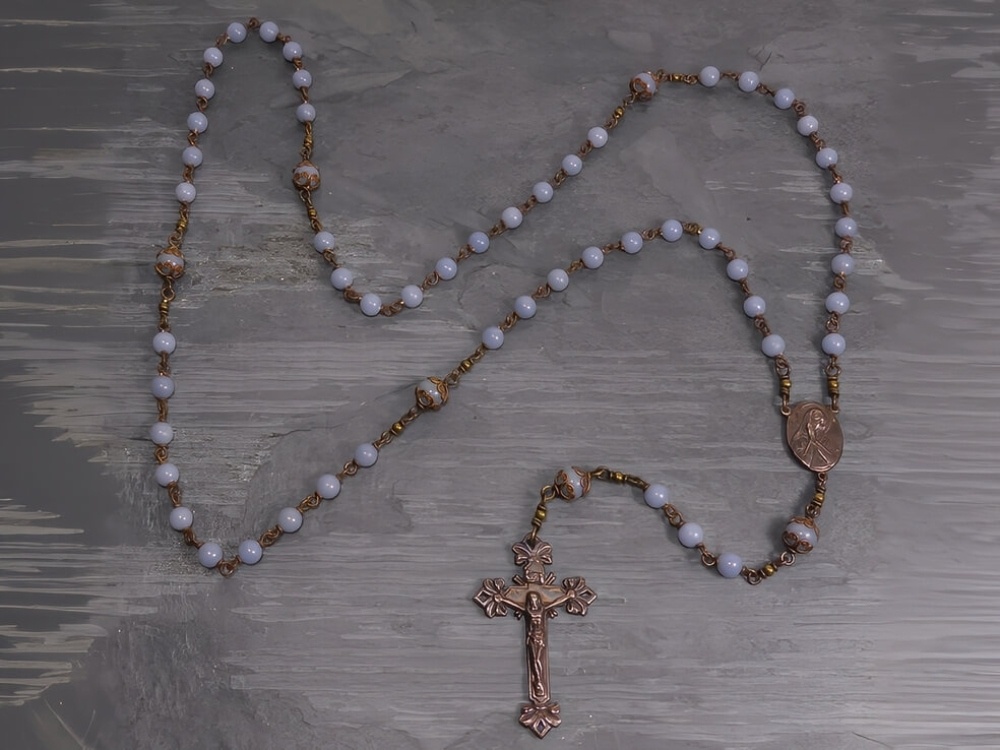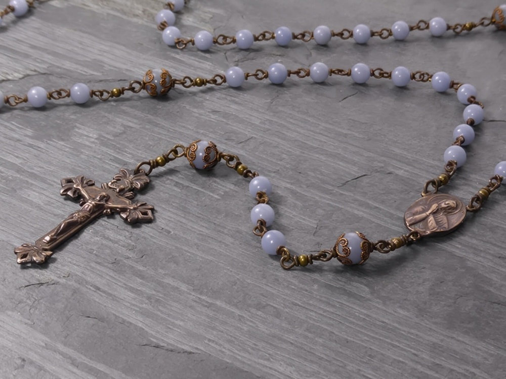 This Rosary has been carefully handcrafted using the traditional wire wrapping method. Each gemstone is individually wrapped by hand in a swirl of 20 gauge antiqued brass wire which makes this rosary very strong and adds beauty to the finished piece.