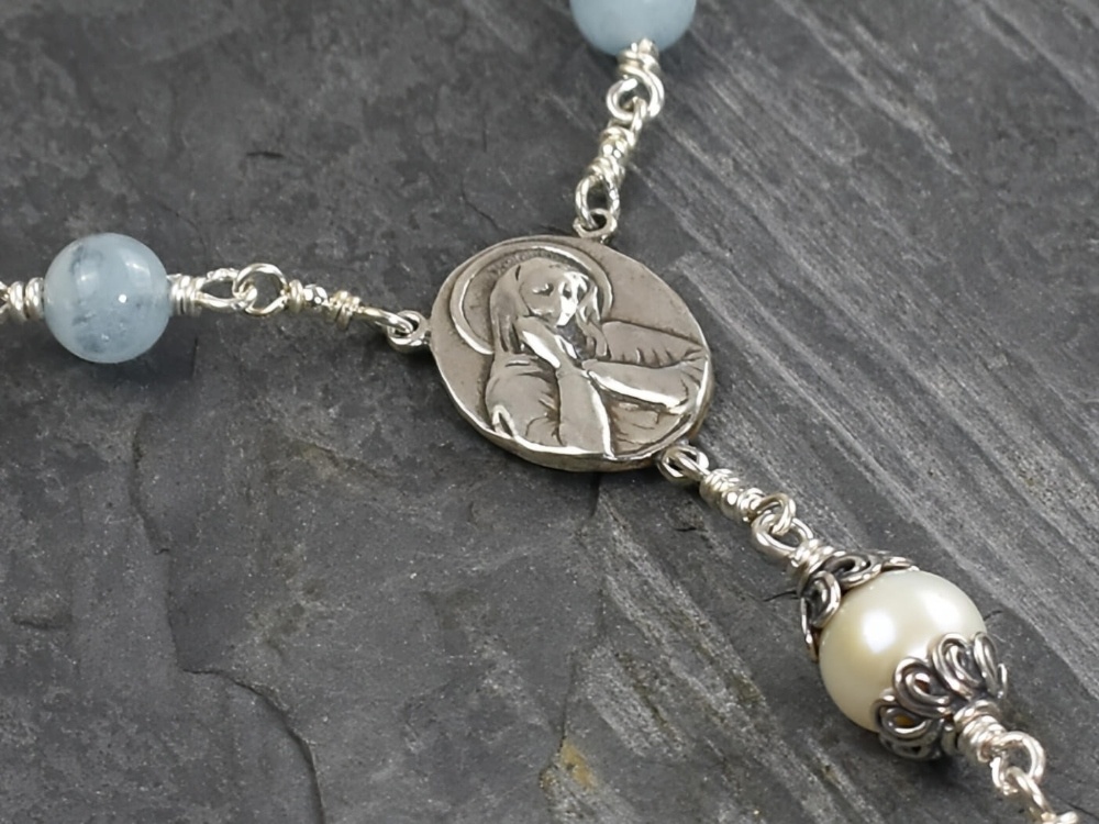 Single decade Grade AA Aquamarine & Freshwater Pearl Sterling Silver Rosary built using 8mm aquamarine gemstones with a single 10/11mm Freshwater Pearl Our Father.
