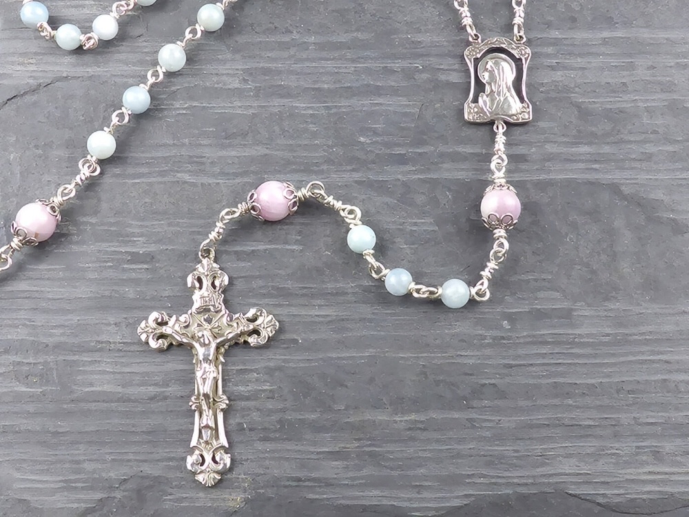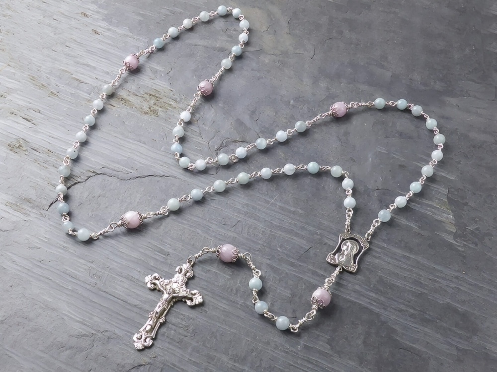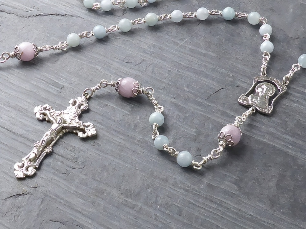Built using 6mm aquamarine gemstone beads with larger 8mm sterling silver capped pink kunzite Our Father gemstone beads. Perfect every day rosary or First Communion heirloom gift.