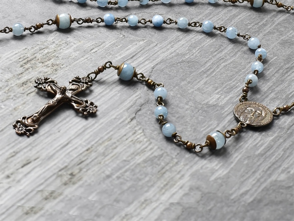 Perfect every day rosary or First Communion heirloom gift this Aquamarine Rosary is built using grade AA aquamarine gemstones (6mm gemstones with larger 8mm capped Our Fathers).