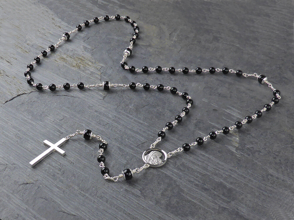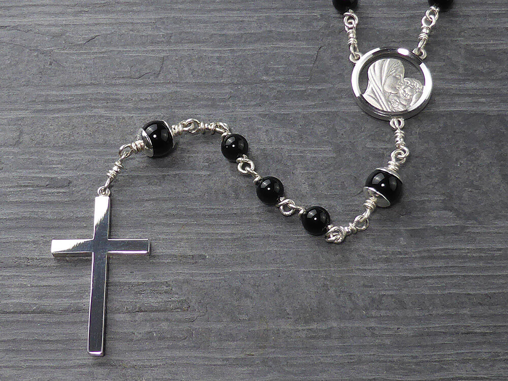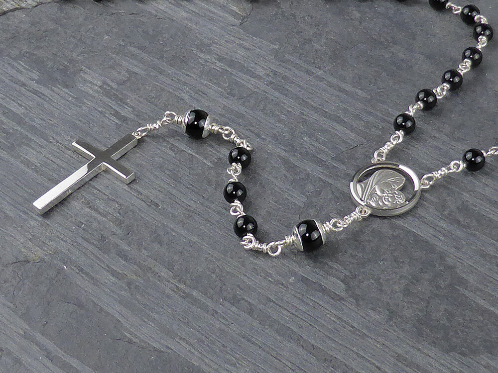 This is a beautiful rosary is made with deep black gemstones and sterling silver capped Our Father beads. The cross is solid sterling silver and of exceptional quality, weighing approximately 4.8 grams. Perfect for an every day rosary or for a First Communion Heirloom gift. This truly is a beautiful rosary – one that will be treasured.