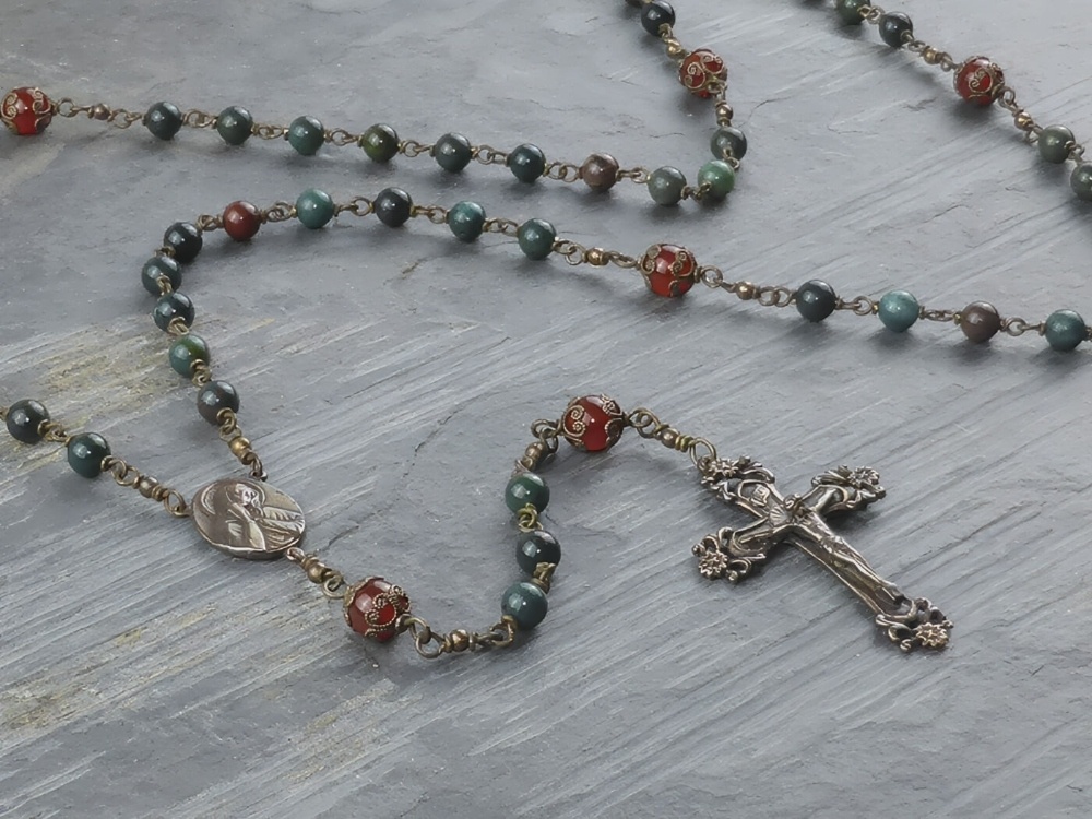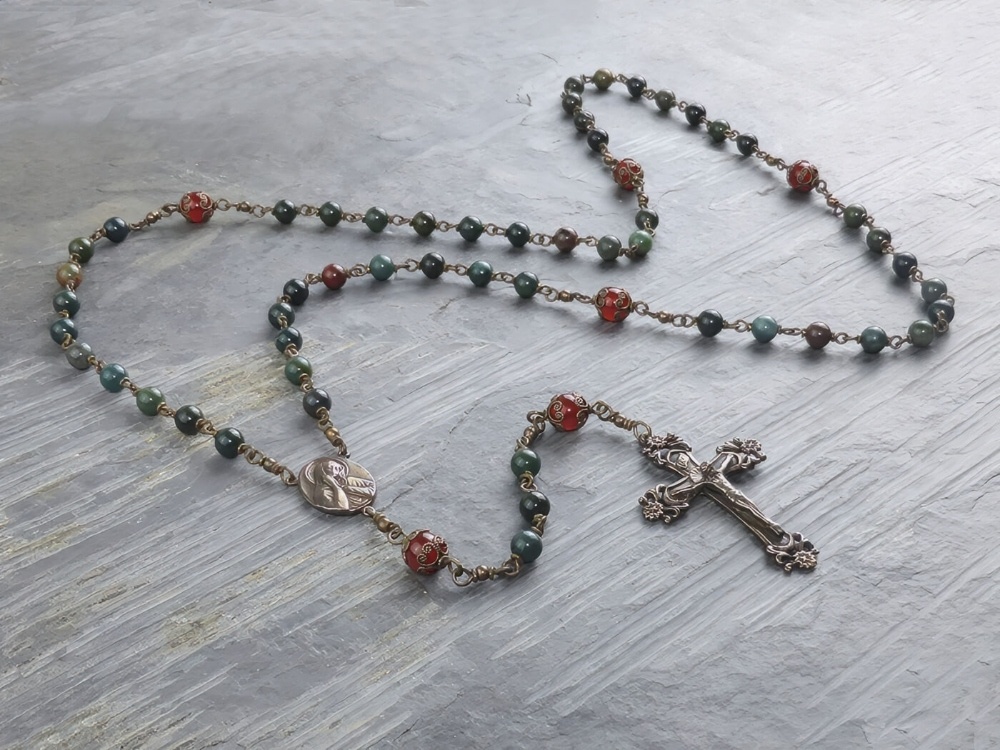 This rosary has been carefully handcrafted using the traditional wire wrapping method. Each gemstone is individually wrapped by hand in a swirl of 20 gauge antiqued brass wire which makes this rosary very strong adds beauty to the finished piece.