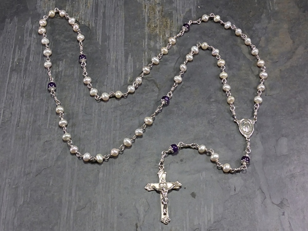 Freshwater Pearl & Amethyst Gemstone Rosary (wire wrapped in argentium silver wire)