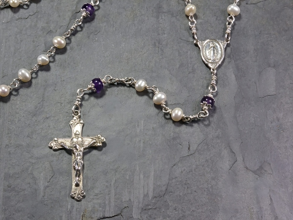 Freshwater Pearl & Amethyst Gemstone Rosary. 5/6mm pearls with larger 6mm Amethyst Our Fathers. The sterling silver antique cast centrepiece & crucifix are cast from antique pieces.
