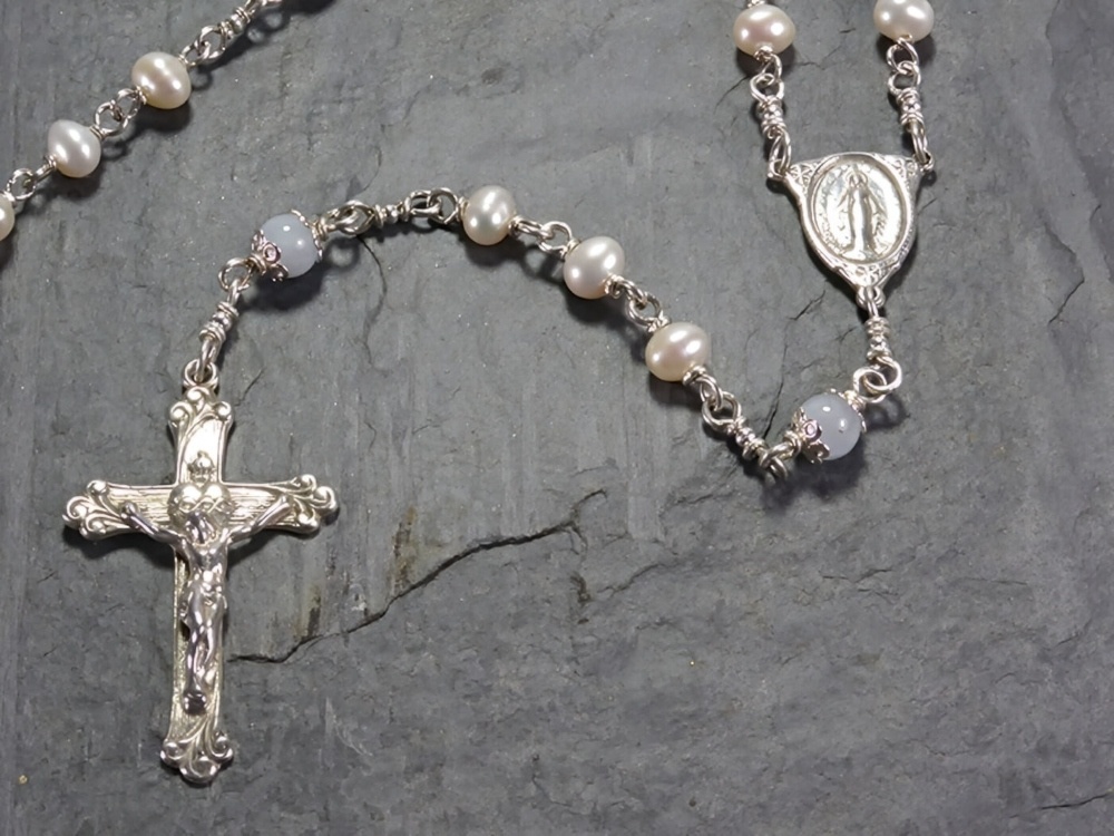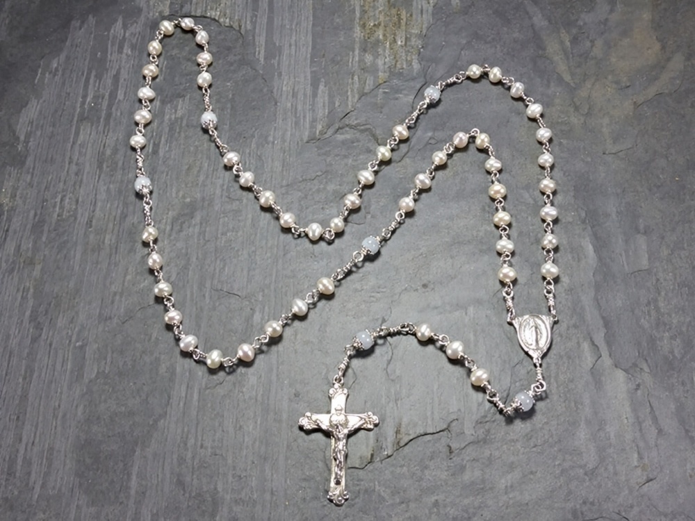 This Rosary has been carefully handcrafted using the traditional wire wrapping method. Each pearl is individually wrapped by hand in a swirl of argentium silver which adds beauty to the finished piece. Argentium silver wire contains a higher content of pure silver than sterling silver and so is more tarnish resistant.
