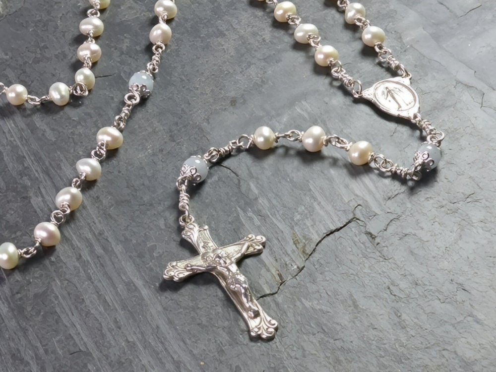 Freshwater Pearl & Aquamarine Gemstone Rosary (wire wrapped in argentium silver wire)