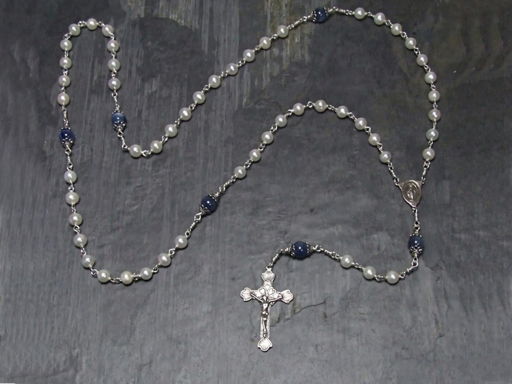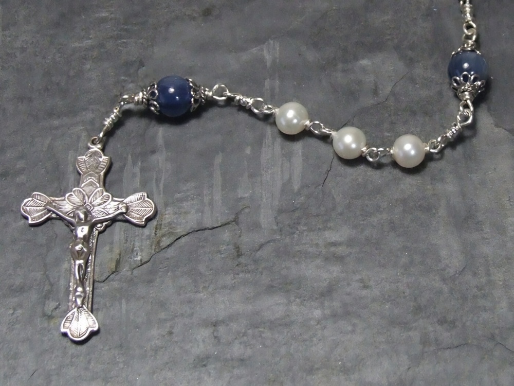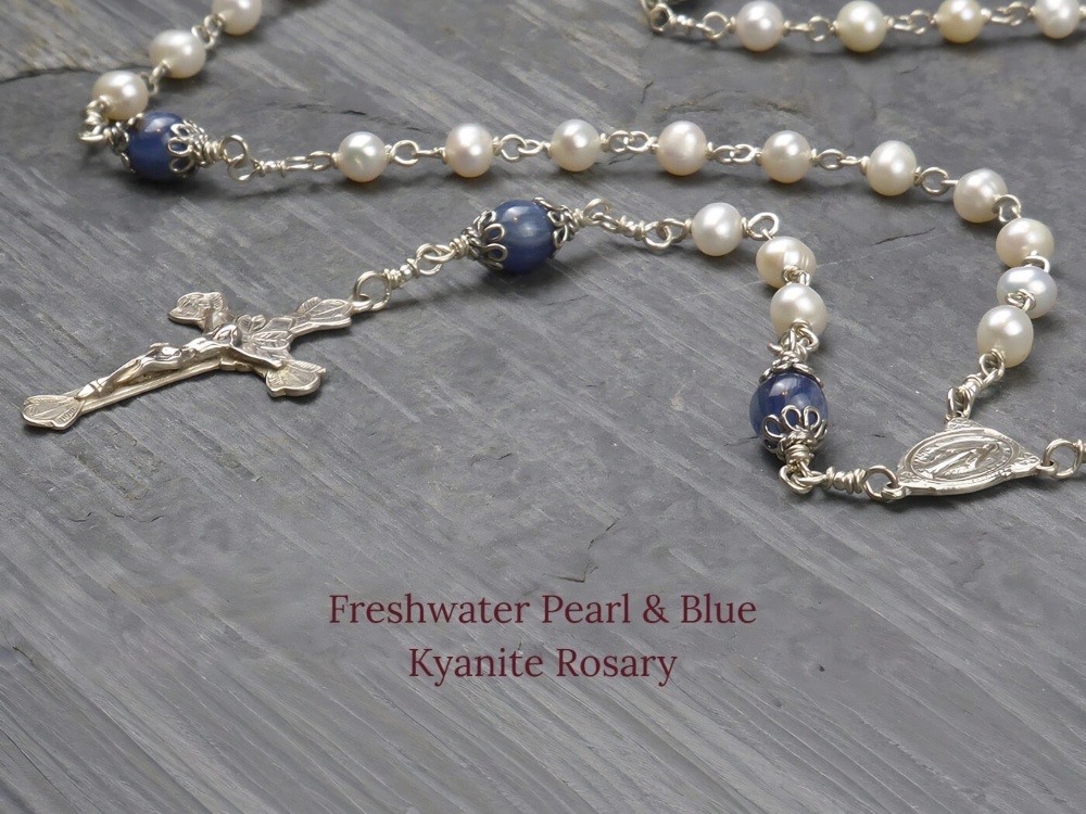 The Our Father beads are silver capped Grade AA Blue Kyanite gemstones. Kyanite is known to help drive away stress and anziety leaving a calming effect on the whole being.The freshwater pearls mixed with the blue kyanite gemstones are simply beautiful. 6/7mm freshwater pearls and 8mm blue kyanite gemstones. The sterling silver Miraculous centrepiece and etched flower & heart crucifix are hand cast from antique pieces. This rosary is often purchased for a First Communion heirloom gift.