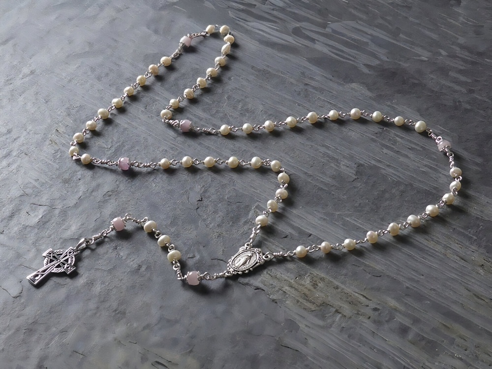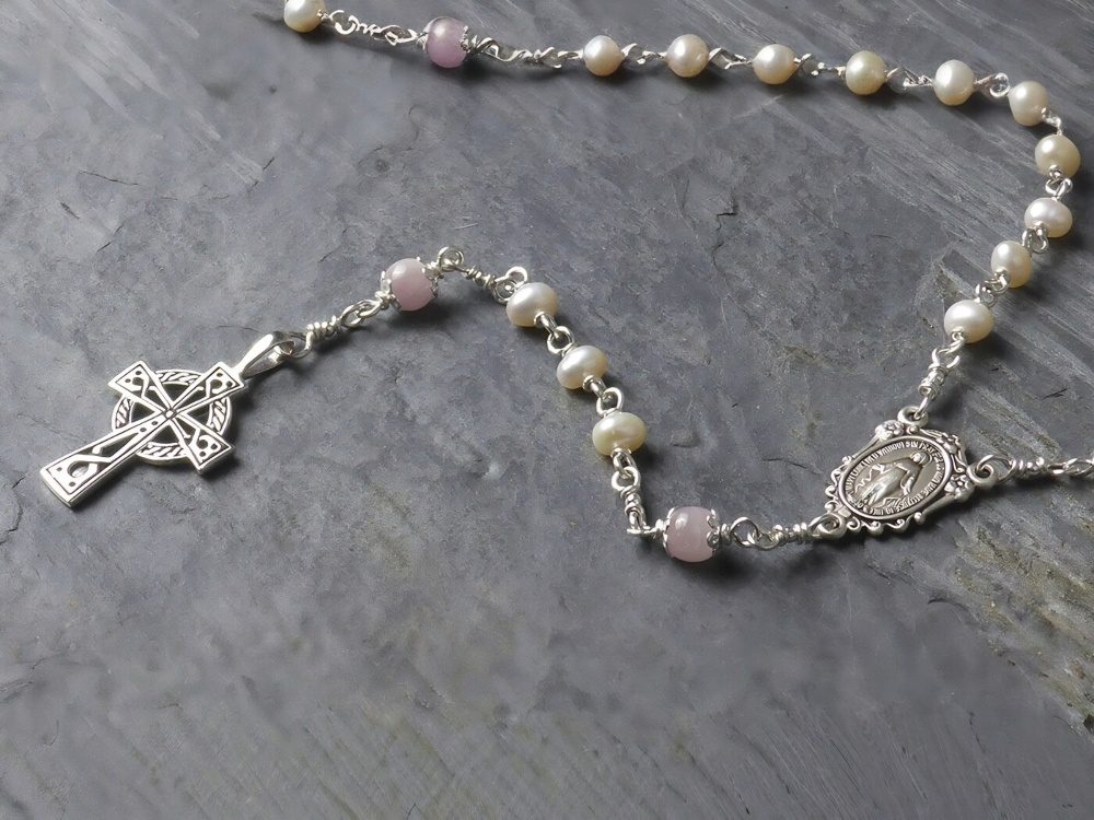 This rosary has been carefully handcrafted using the traditional wire wrapping method. Each pearl is individually wrapped by hand in a swirl of argentium silver which adds beauty to the finished piece.