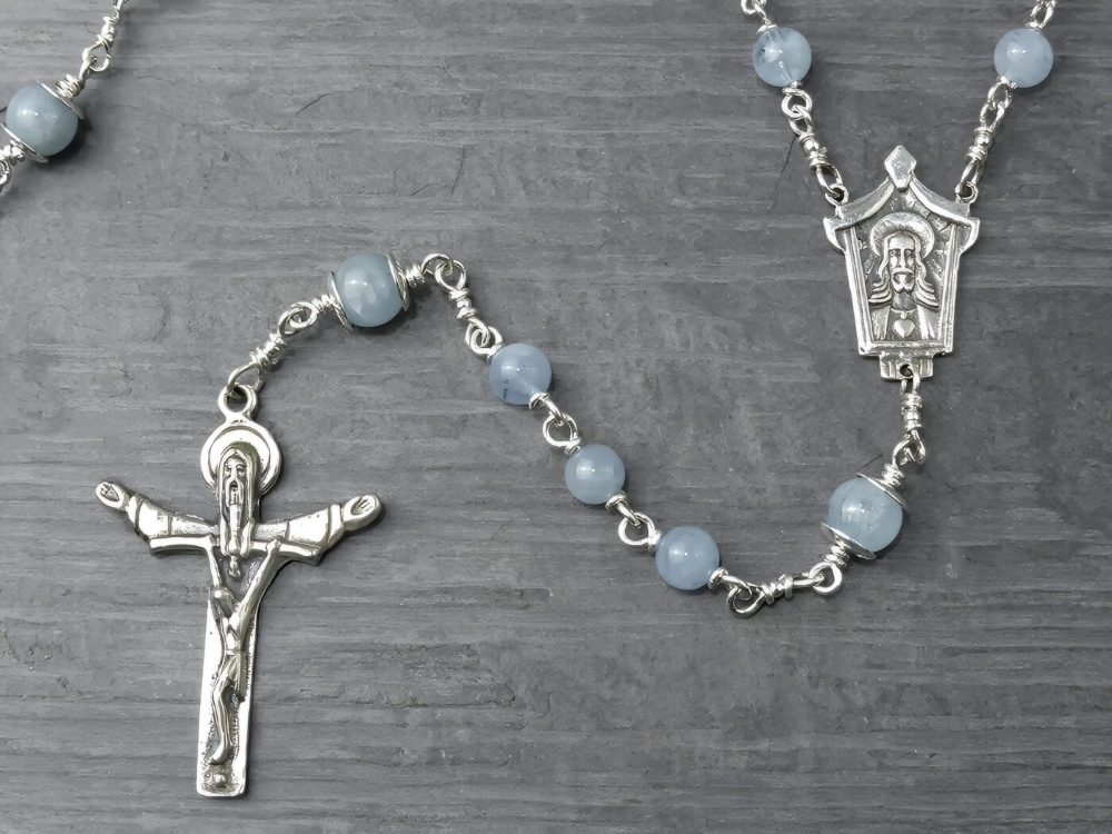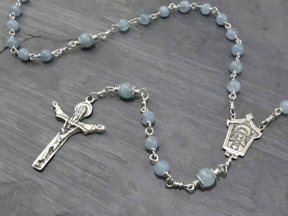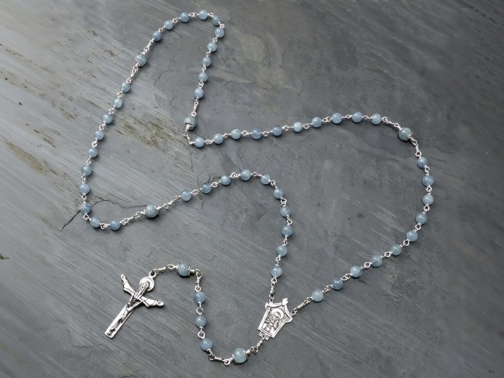 This rosary is built using grade AA aquamarine gemstones (6mm gemstones with larger 8mm capped Our Fathers).