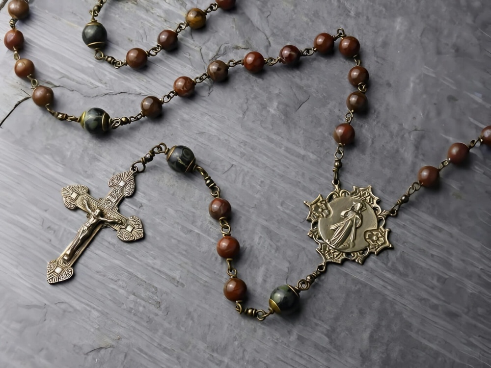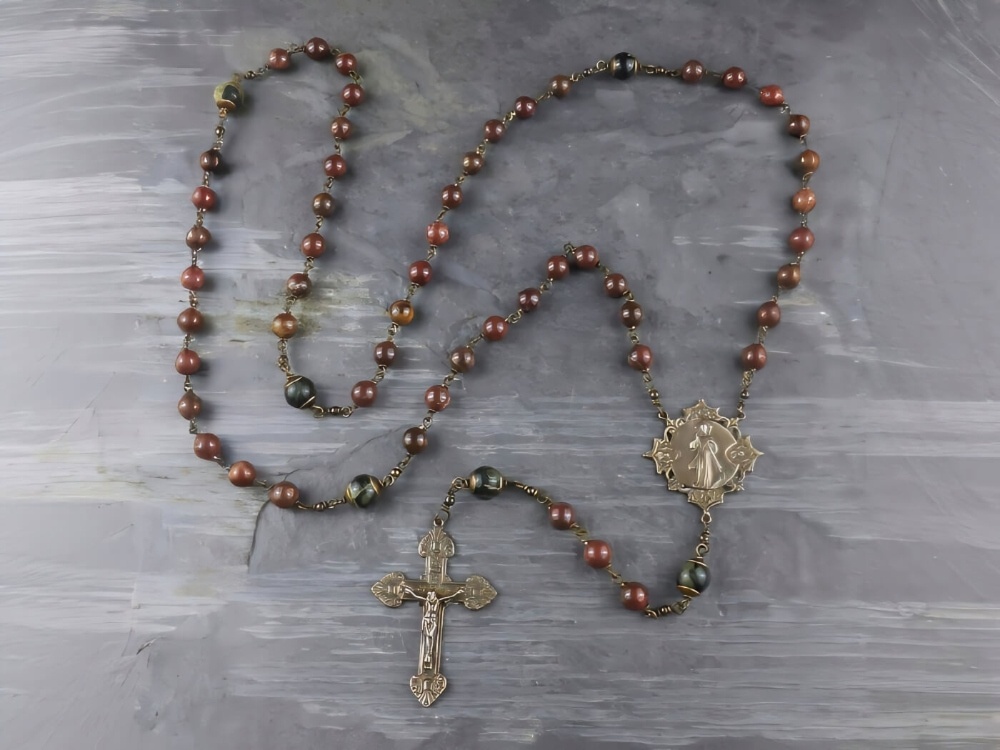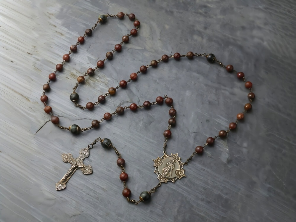 8mm Poppy Jasper and 10mm Kambaba Jasper Gemstone Rosary. These Poppy Gemstones are a rich reddy brown colour. The crucifix and centrepiece are cast from antique pieces then antiqued to restore original patina.