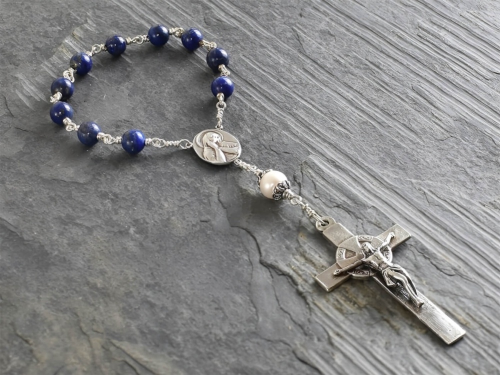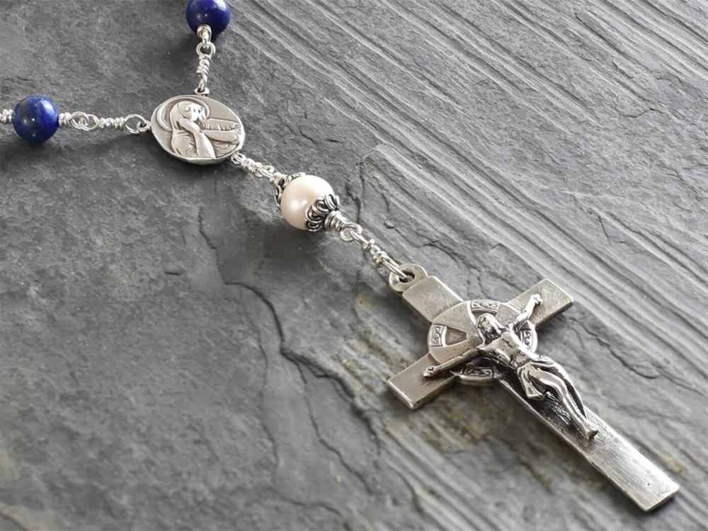 Lapis Lazuli rosary built using 8mm gemstone beads with one 10mm Freshwater pearl Our Father.