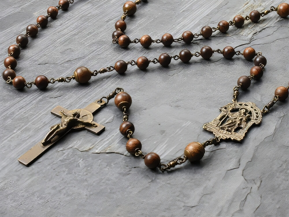 The rosary is built using 7.5mm coconut wood beads with larger 10mm Our Father beads.