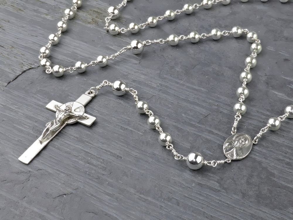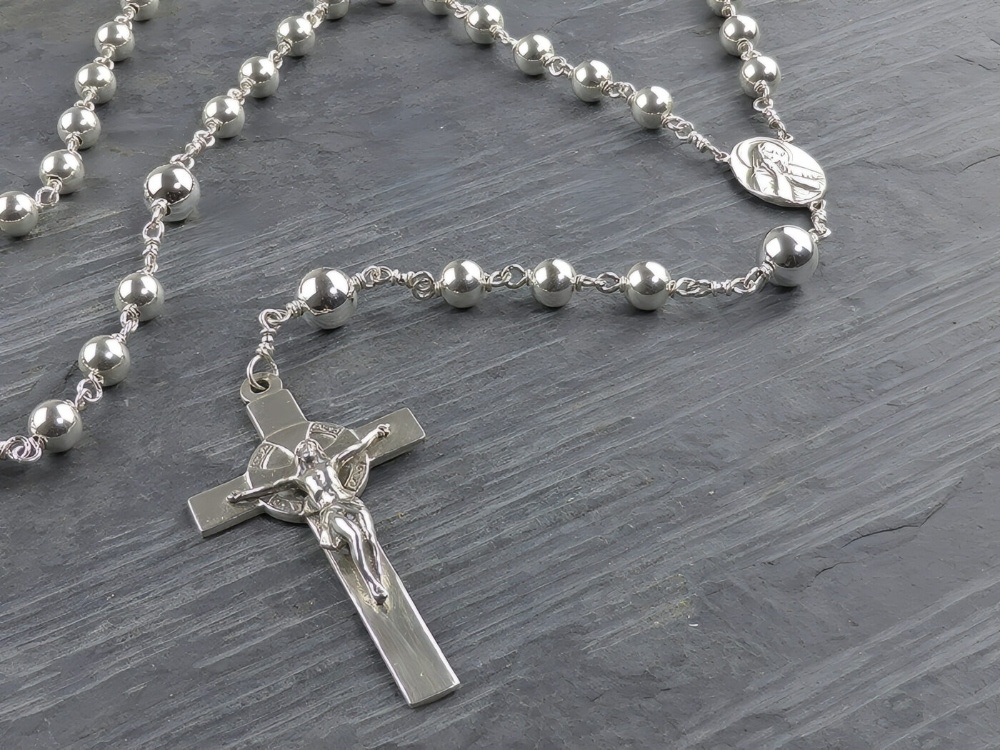 Sterling Silver Rosary built using 8mm sterling silver beads with larger 10mm sterling silver Our Father beads.